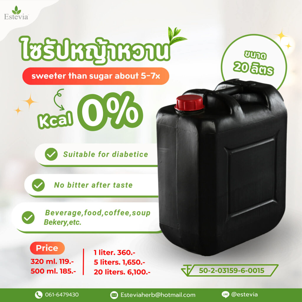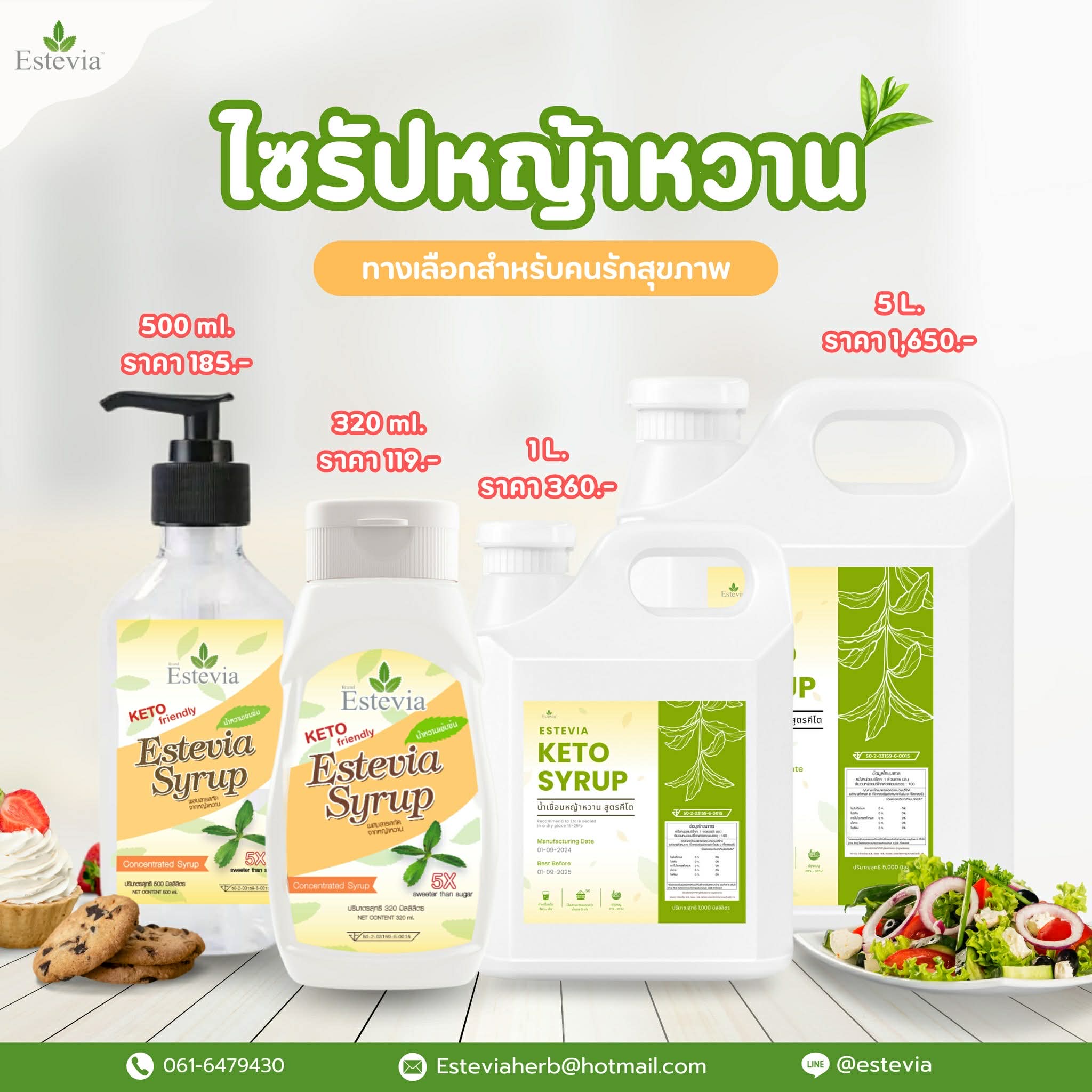 เติมรสหวานให้กับทุกเมนูโปรดของคุณด้วย “น้ำตาลหญ้าหวาน” (Estevia Syrup) ไซรัปหญ้าหวาน สารสกัดหญ้าหวาน ให้ความหวานมากกว่าน้ำตาลทราย 5-7 เท่า รสชาติหวานไม่ติดขม ใช้แทนน้ำตาลได้ทุกเมนู รสชาติหวานอร่อยใกล้เคียงน้ำตาลมาก ใช้ใส่ได้ทั้งอาหาร เครื่องดื่ม ชา กาแฟ ขนม ไอศครีม โยเกิร์ต น้ำผลไม้ ชาเขียว น้ำเต้าหู้ ฯลฯ
